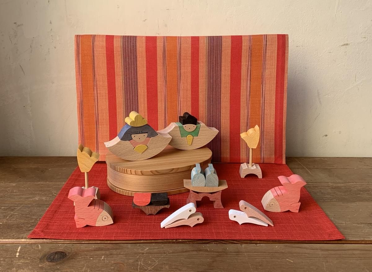 雛人形と2匹の鯛、4本の「鯛の鯛」を卵形の曲げわっぱに納めました。「鯛の鯛」は硬骨魚の胸鰭の部分にある骨で、鯛のような形をしています。江戸時代の文献に「鯛中鯛」の字が見られ、「めでたい鯛の中でさらにめでたい形である」とされ、縁起物としてよろこばれていました。「鯛の鯛」は鯛の尾、鰭の上に飾ってもよさそうです。