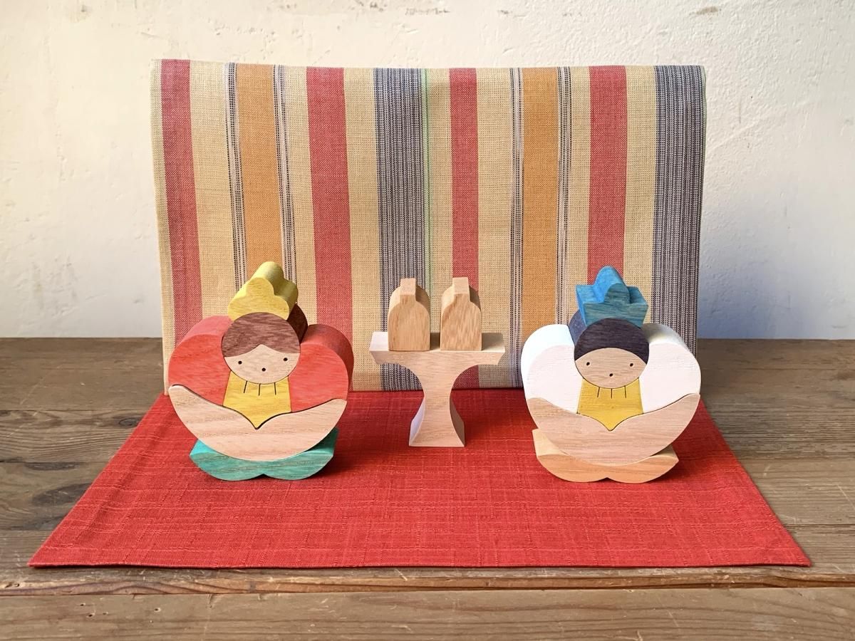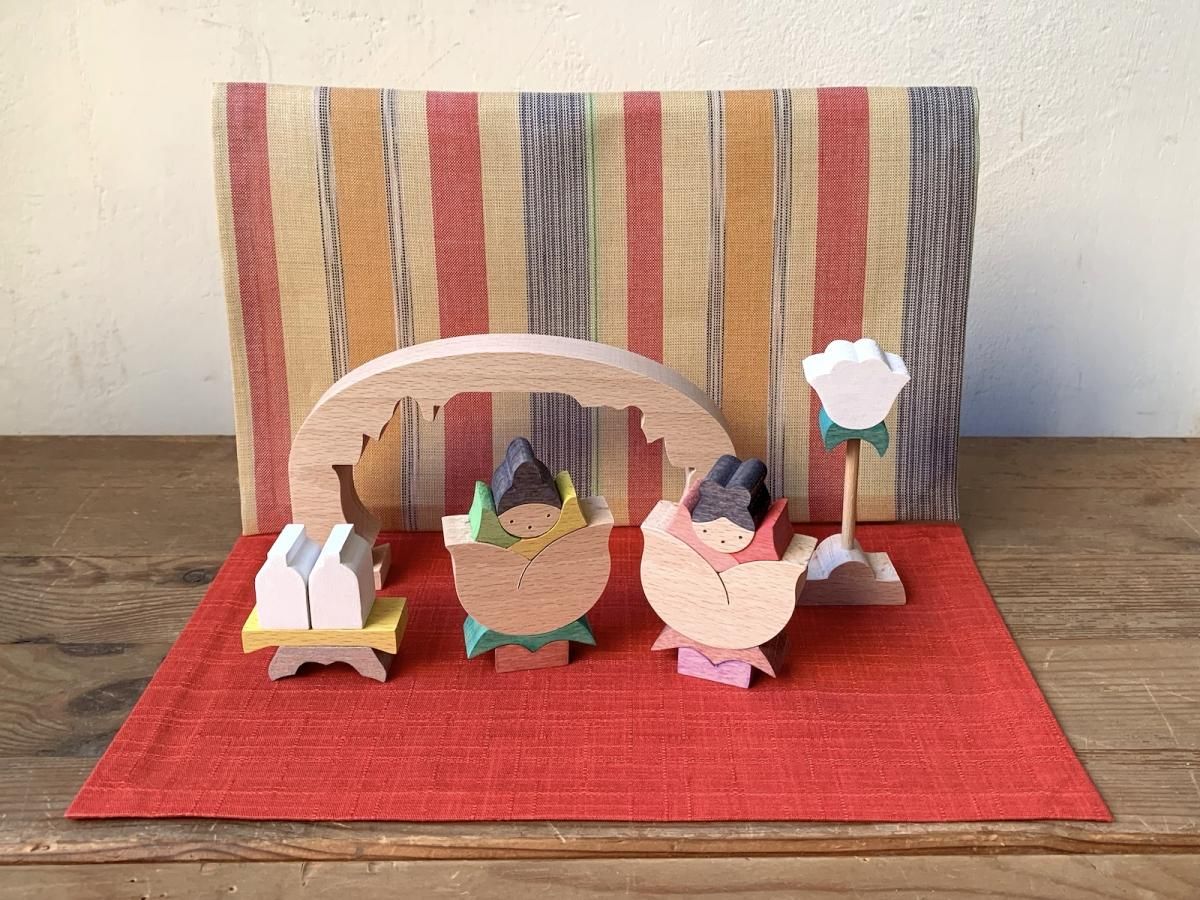 普通垂幕ともうせんのセットです。組み木の雛人形と組み合わせると、省スペースで飾ることができる節句人形になります。