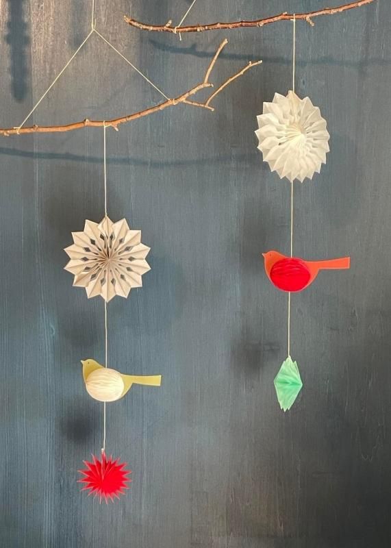 薄い紙を交互にずらしながら何枚も貼り合わせた工作紙「ハニカムペーパー」を使ってオーナメントを作り、枝に吊るしてモビールに仕上げます。モチーフの色は複数色からお選びいただけるので、写真以外の組み合わせも可能です。