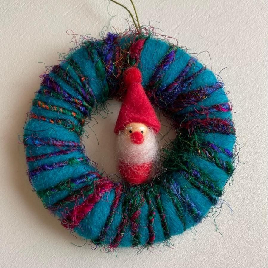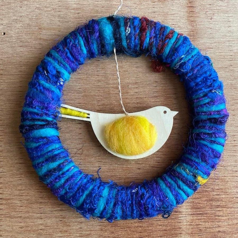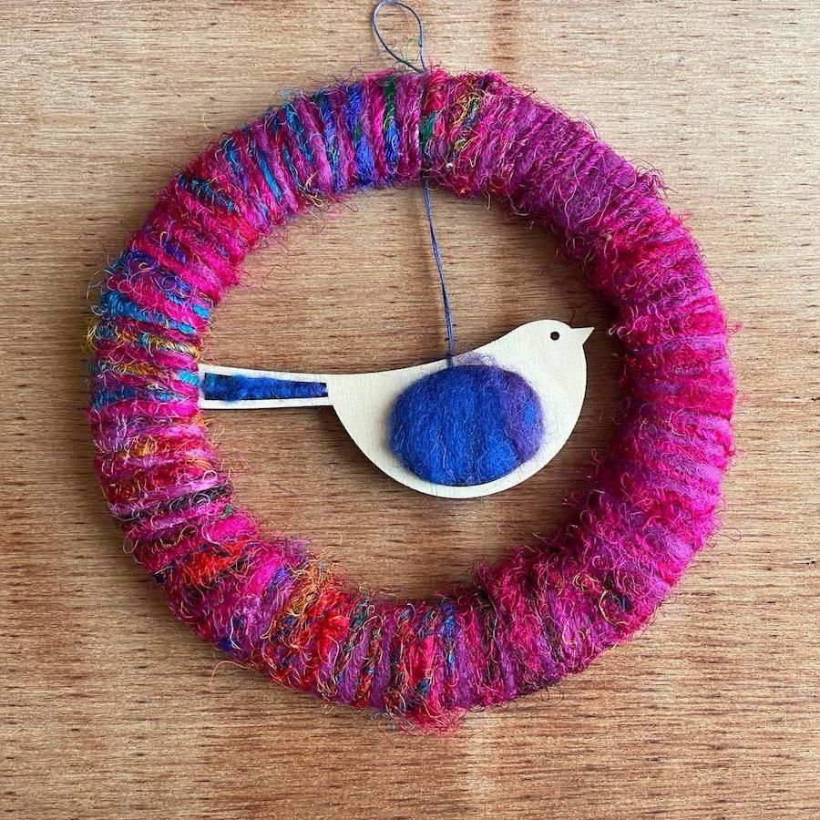 発色の美しいインドサリーの裂き糸とふわふわの羊毛をベースに巻き付けてつくる、世界に一つだけのオリジナルリースです。リース部分の羊毛や裂き糸は複数色ご用意しますので当日好きな色をお選び頂けます。
