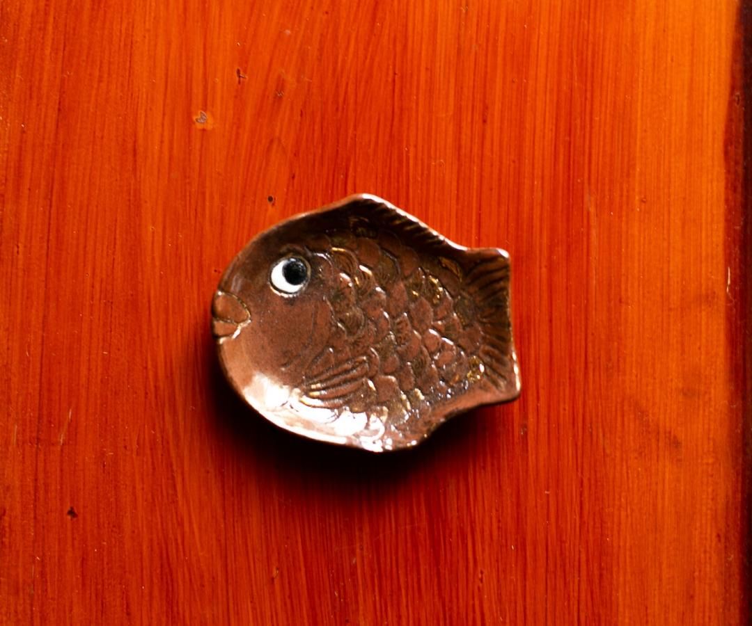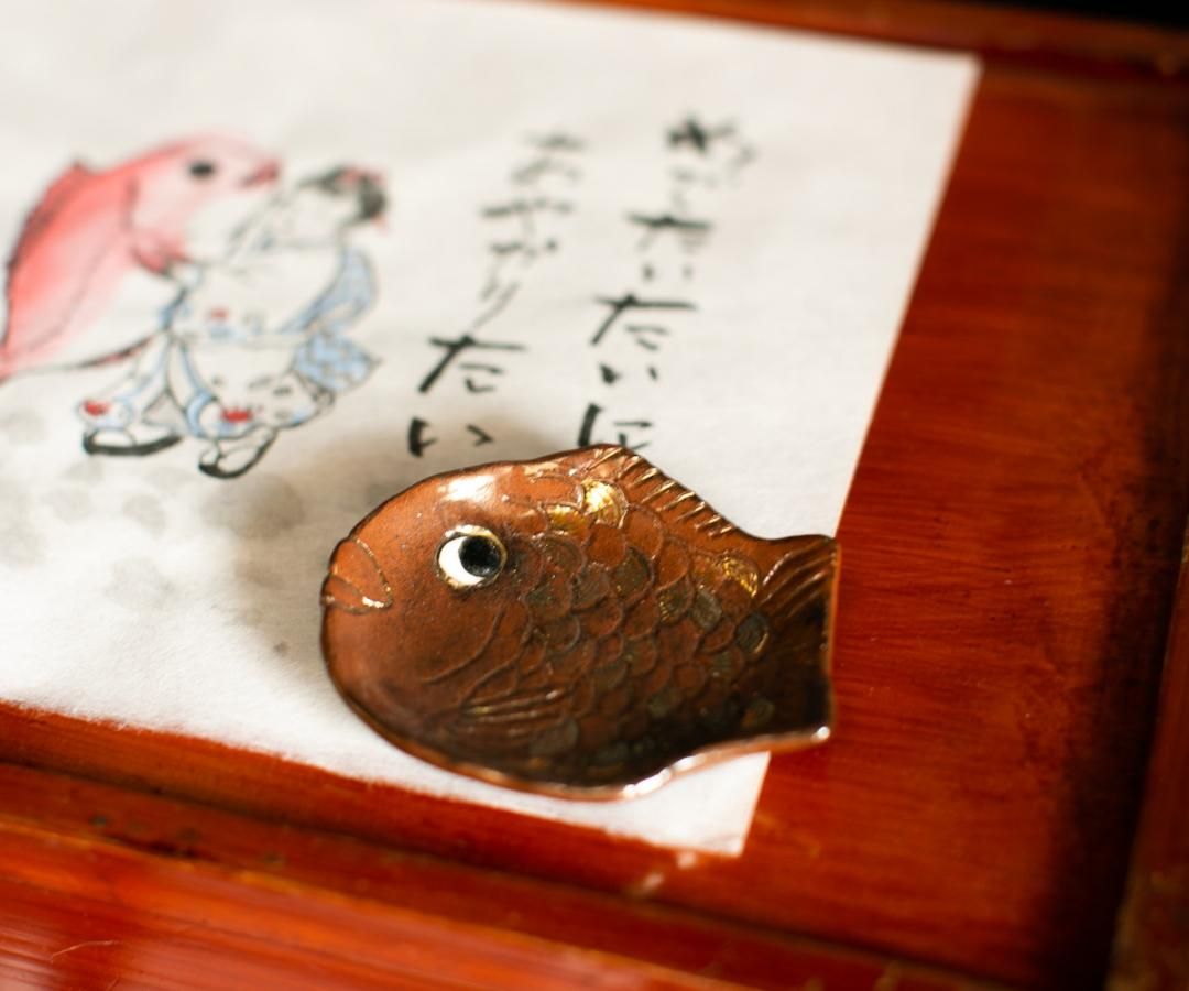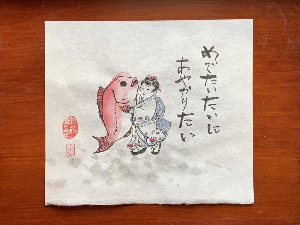 2022年1月7日〜31日に東京「ももも商会」にて開催された「コマとカルタ」展のために制作された7点の縁起物陶作品と対になる形で描き下ろされた作品群の1つで、対となる豆皿「めでたい」は会期中に御成約となりました(写真2〜3点目)。