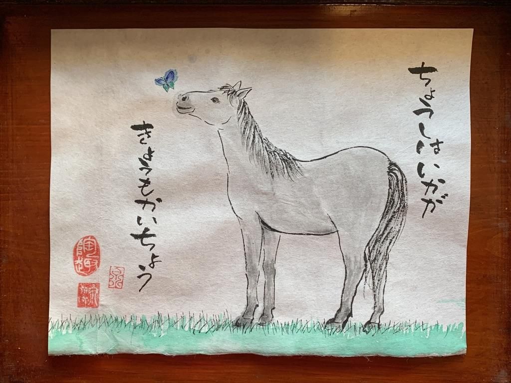2022年1月7日〜31日に東京「ももも商会」にて開催された「コマとカルタ」展のために制作された7点の縁起物陶作品と対になる形で描き下ろされた作品群の1つで、対となる豆皿「瓢箪から駒」は会期中に御成約となりました(写真2点目)。