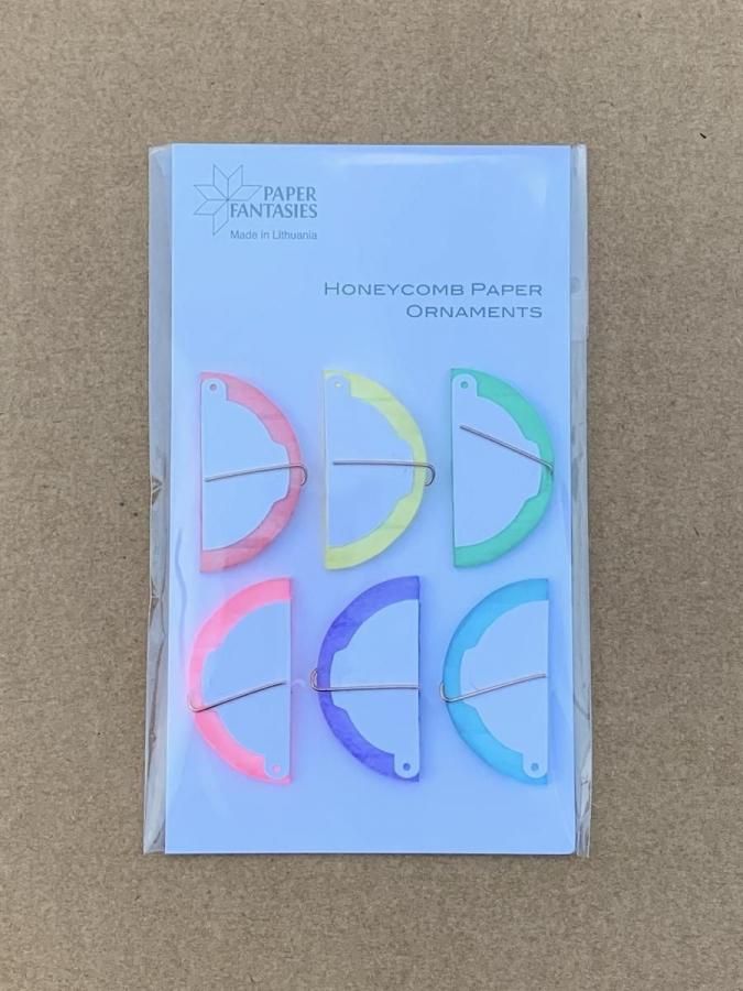 台紙から点線を切り離し、付属の先割れクリップを外します。吊り下げて飾る場合は台紙の穴に糸などを通してから白い厚紙の部分を本を開くように開いて背中合わせにし、付属のクリップで台紙を挟んで留めます。ハニカムペーパーの穴の部分にクリップの先を入れてクリップの背を押せば、クリップが奥に入ります。クリップの先端がハニカムペーパーの奥に突き当たり紙を貫通することもありますが、ボール自体が壊れることはありませので、問題ありません。